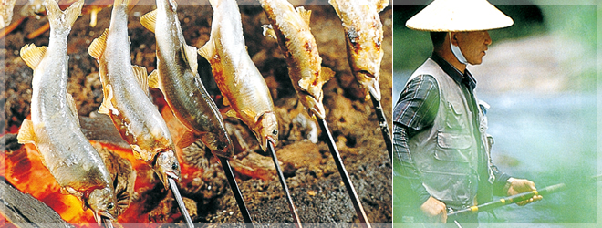 郡上は川釣りのメッカです。2月には渓流釣りが、6月には鮎釣りが解禁となり、多くの釣り人が訪れます。特に鮎は有名で、「清流めぐり利き鮎大会」において、市内を流れる長良川・和良川の鮎が合わせて3回グランプリを受賞しています。また、長良川水系で漁獲される鮎「郡上鮎」は、河川産魚類としては全国で初めて特許庁の地域団体商標に登録されています。夏は郡上でおいしい鮎を釣って食してはいかがでしょう。