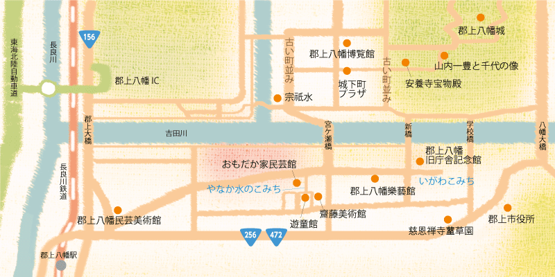 東海北陸自動車道の郡上八幡IC直前の亀尾島トンネル(下り線)を抜け、右手に広がる市街地が郡上八幡。真っ先に目にとまるのが市街地奥の山頂にそびえる郡上八幡城です。城下町として発展してきた郡上八幡の市街地内には、古い町並みやきれいな水路、水を生かしたポケットパーク(小公園)、全国名水百選の宗祇水、郡上八幡を総合的に紹介している郡上八幡博覧館、登録有形文化財となっている郡上八幡旧庁舎記念館など、見どころが多くあります。散策をしながら風情ある町並みを楽しみましょう。城山中腹の城山公園には山内一豊と千代の銅像があり、絶好の記念写真ポイントです。