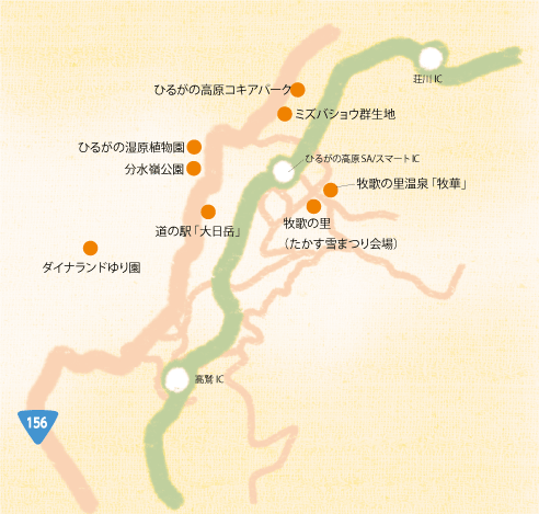 郡上市の北端に位置する標高約900メートルのひるがの高原は、長良川と庄川の源流にあたり、分水嶺が有名です。夏は避暑地として、冬はウインタースポーツのメッカとして、一年中お楽しみいただけます。近年は、ダイナランドのゆり園、牧歌の里のチューリップやラベンダー、ひるがの高原スキー場のコキアパーク、ひるがの湿原植物園やミズバショウの群生地など、花や植物も楽しんでいただけます。旅館・民宿はもちろん、おしゃれなペンションやプチホテルが多いのも特徴です。爽やかな高原で一日を過ごしてみてはいかがでしょうか。