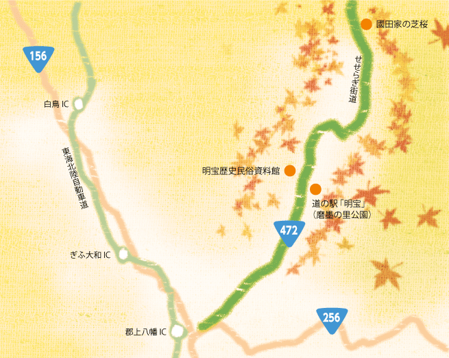 郡上八幡から高山市へ向かう「せせらぎ街道」は、せせらぎの音とともに春は新緑、秋は紅葉が楽しめ、ドライブにうってつけの道路です。有料区間であった飛騨美濃有料道路も平成22年4月から無料化されました。道中にはめいほう高原があり、冬のスキー以外にも自然を満喫できます。イベントが行われる日もあります。スロードライブを美しい風景とともにどうぞお楽しみください。